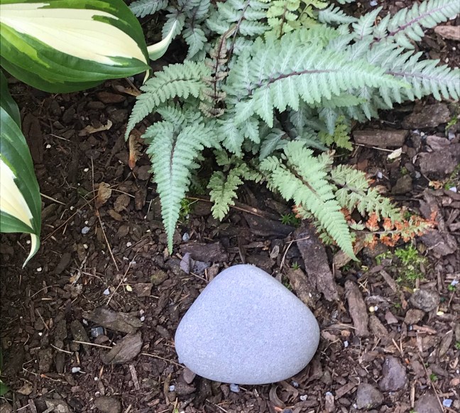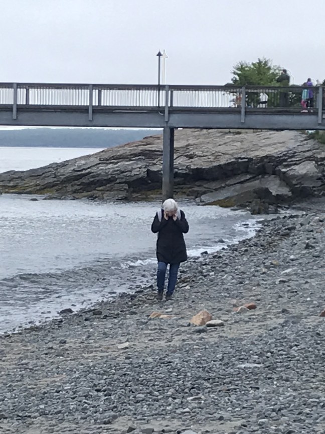 Ann saunters down the short stretch of rocky beach, eyes trained on the ground before her, searching for elusive beach glass and unusually shaped and colored beach stones. I’m wearing my navy Sketchers with white soles, and I don’t want to get them wet and dirty, so I have decided to sit still on a large stone at one end of the beach and wait for Ann to carry out her meticulous search.