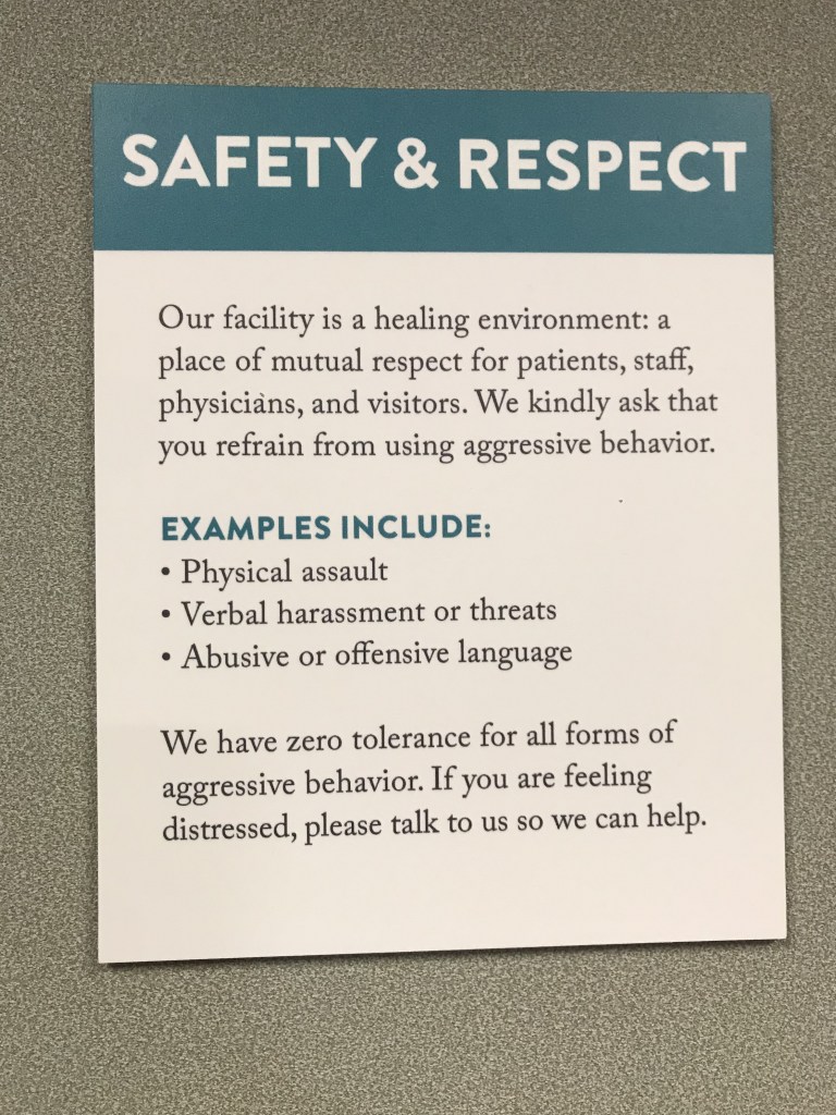 A couple of weeks after my conversation with the healthcare professional in my community, I went to a specialist’s office at the local hospital. I saw kindness signs posted at every turn of the corridor, in every elevator, and at three different sites within the specialist’s reception area—a desperate plea to patients to calm themselves and treat others respectfully.